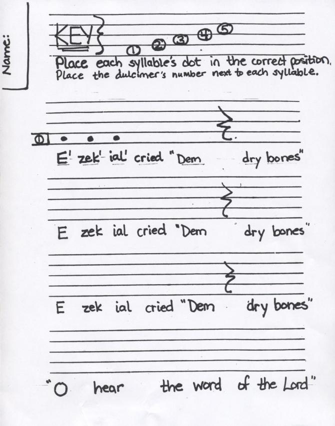 Students will identify pitch number and draw note heads on the music staff using the melody of "Dry Bones" (see attached worksheet). First, as students sing, they identify the pitch number of each syllable, placing the number next to that syllable. Next, the student draws the note head on the staff directly above the syllable. (A key is given at the top to show the placement of the note heads on the staff.)