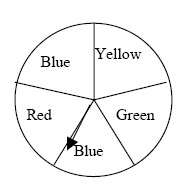 Ans. The spinner is not fair. Two of the five equal segments are blue. The probability of landing on blue is 2/5. The probability of landing on red is 1/5, the probability of landing on yellow is 1/5, and the probability of landing on green is 1/5.